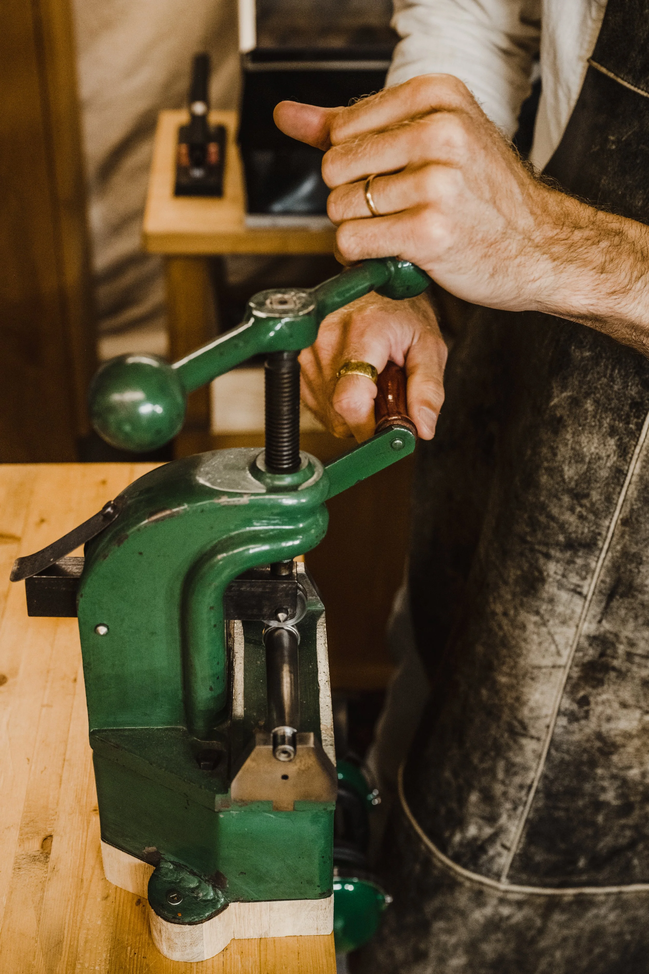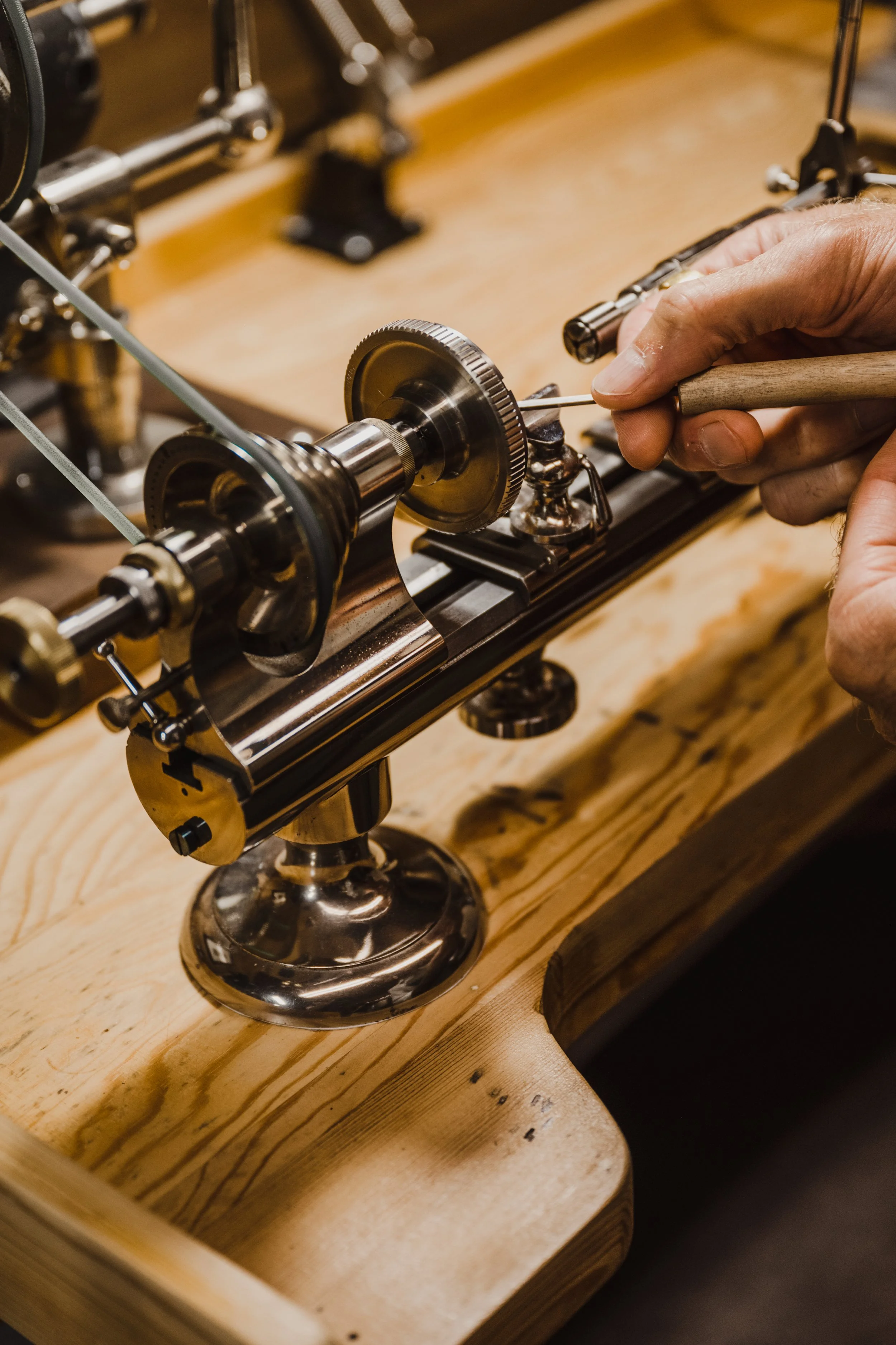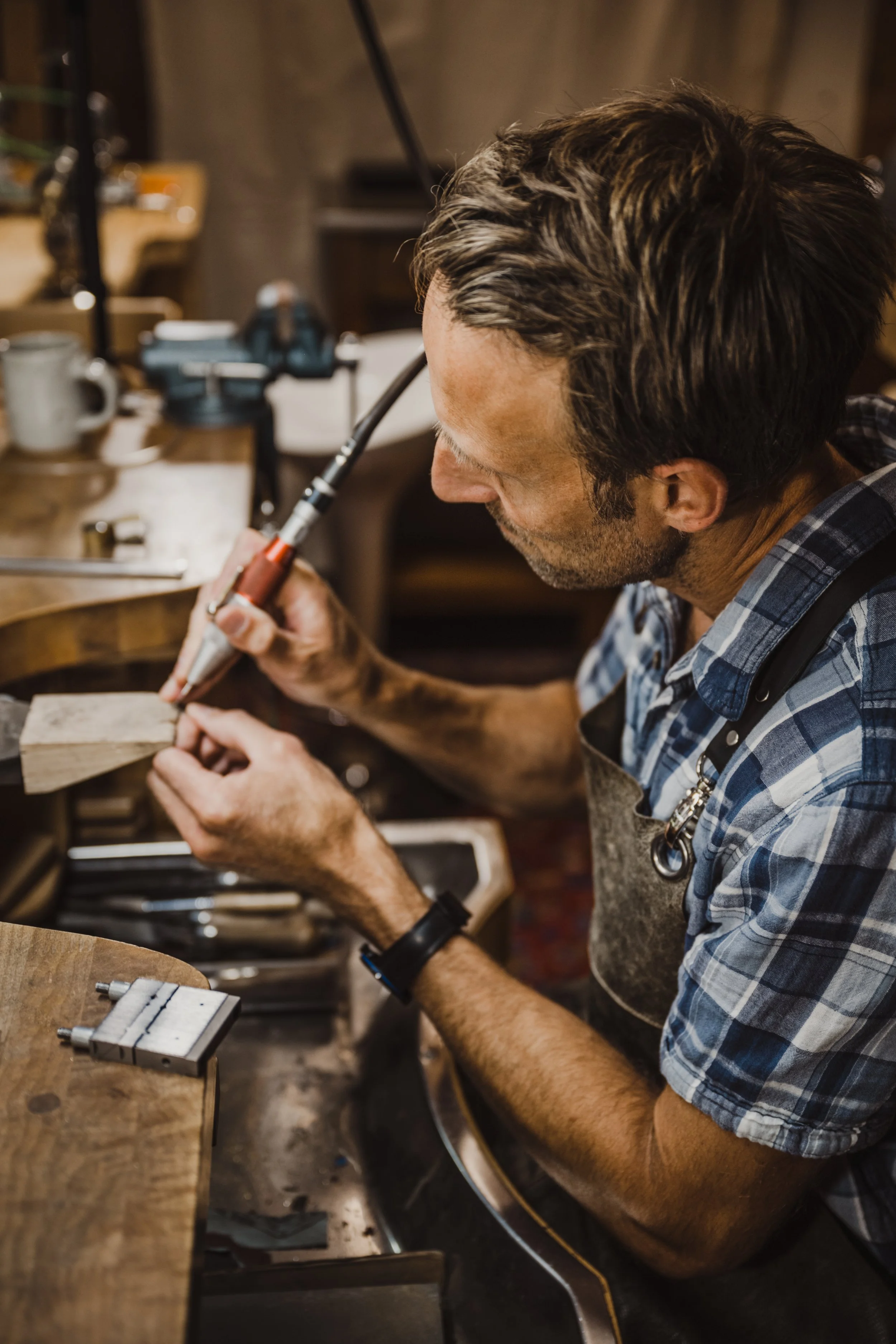 The studio contains a variety of tools both antique and modern. The primary focus of our workshop is to produce pieces in the most traditional methods possible with the intention of creating works that last for generations. This means that most pieces that are created here are forged by hand resulting in unmatched quality and integrity (forged metal of all types are stronger due to a finer grain structure conforming to the shape of the item). We use the modern aids of a binocular microscope and pneumatic engraver for stone setting, oxygen torch and vintage watchmakers lathe.